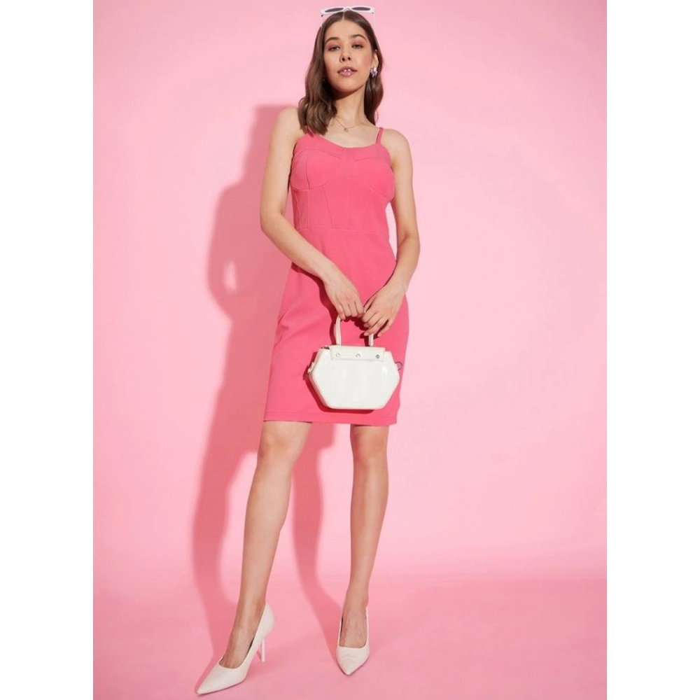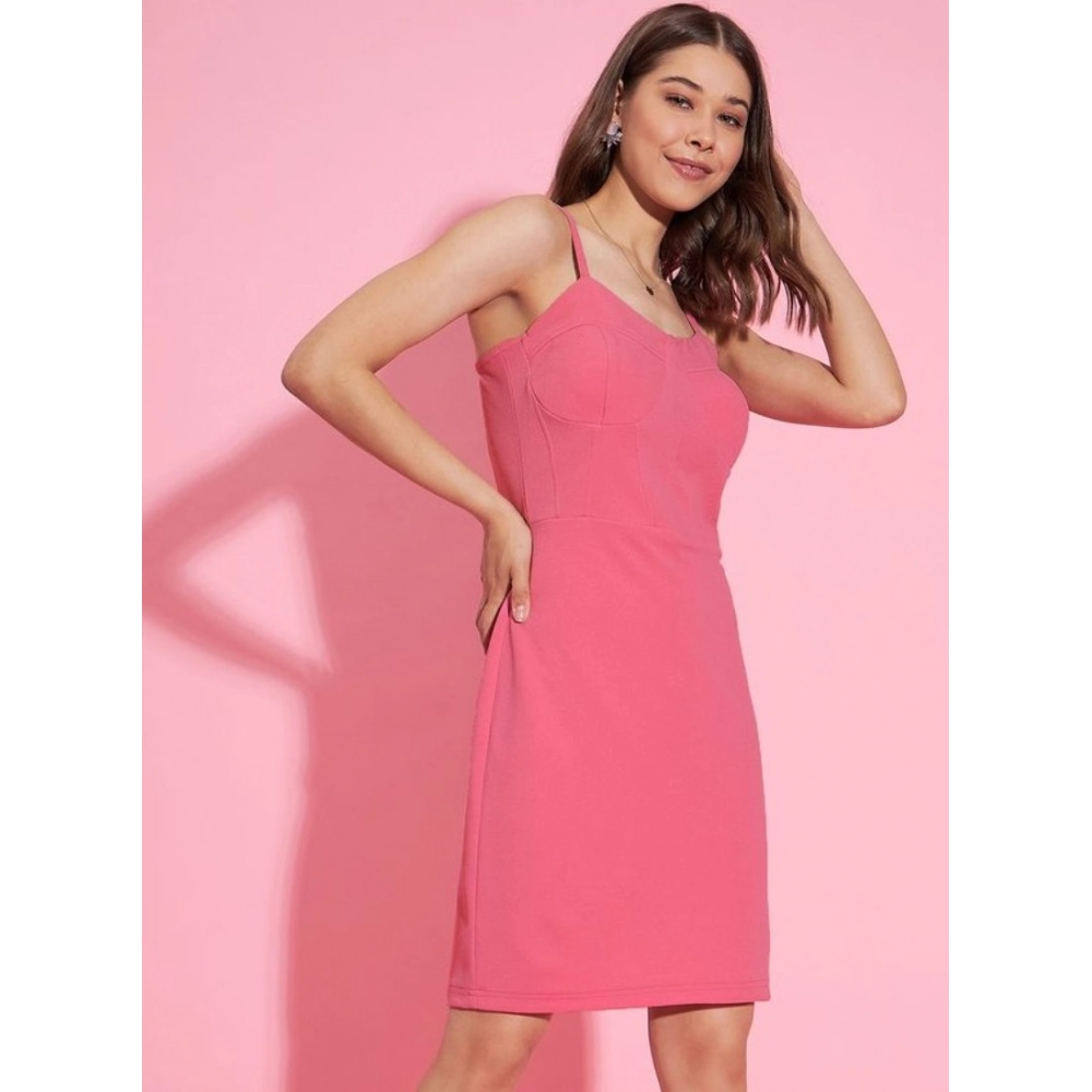 Women's Polyester Lycra Solid Shoulder Straps Dress (Pink)