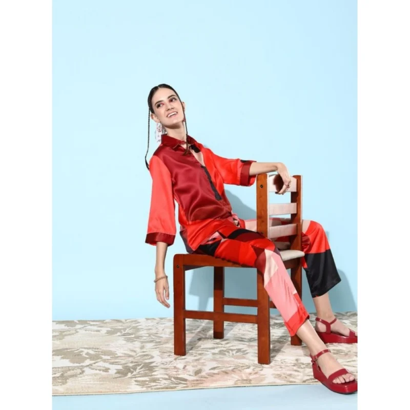 Women’s Satin Colour Block Long Sleeves Co-Ord Set (Multicolor)