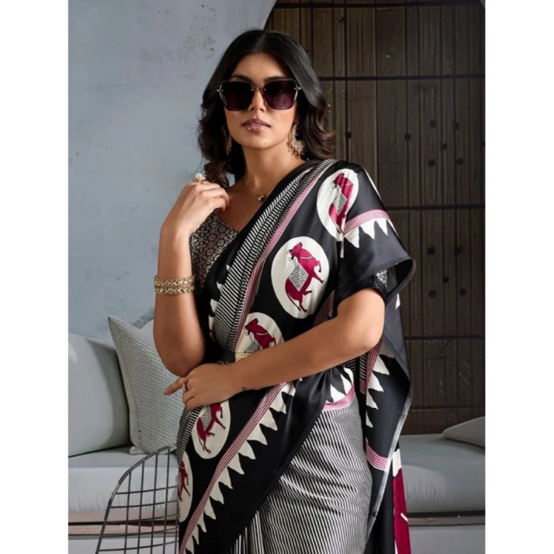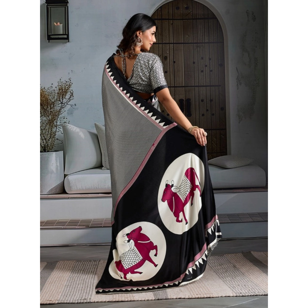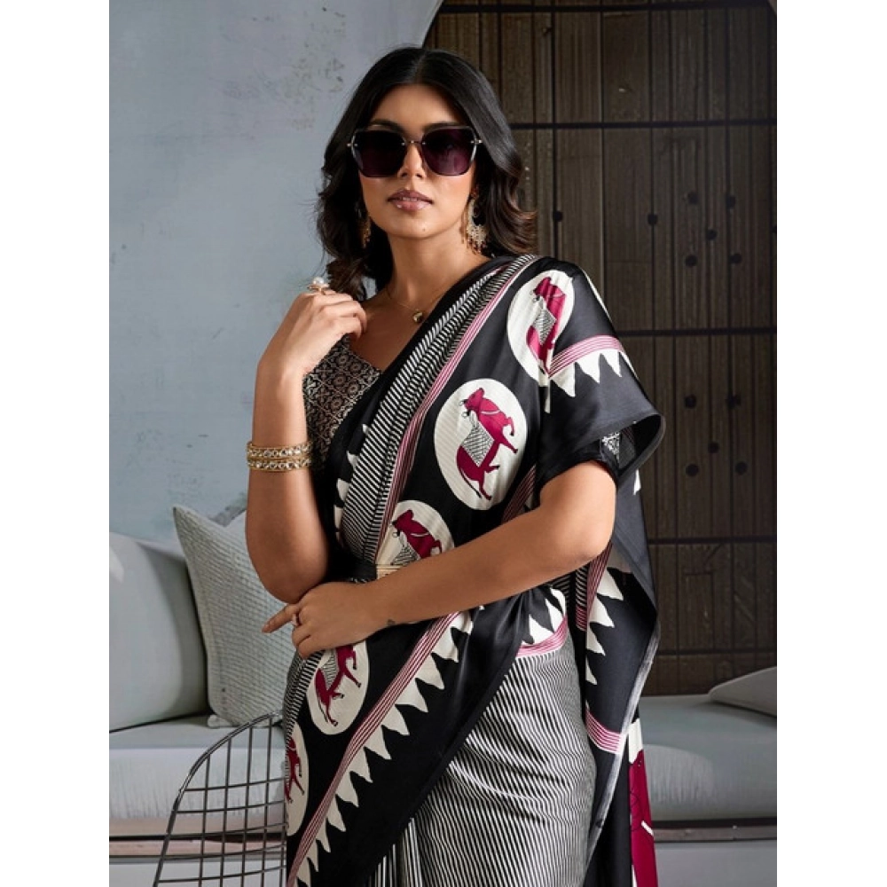 Women's Satin Crepe Printed Saree With Unstitched Blouse 5.5Mtr (Black)