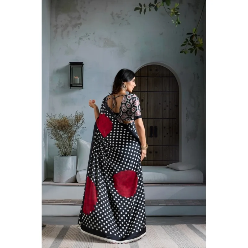 Women’s Satin Crepe Printed Saree With Unstitched Blouse 5.5Mtr (Black)