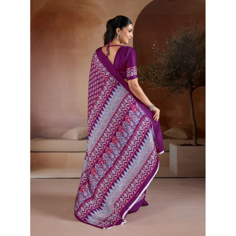 Women's Satin Crepe Printed Saree With Unstitched Blouse 5.5Mtr (Purple)