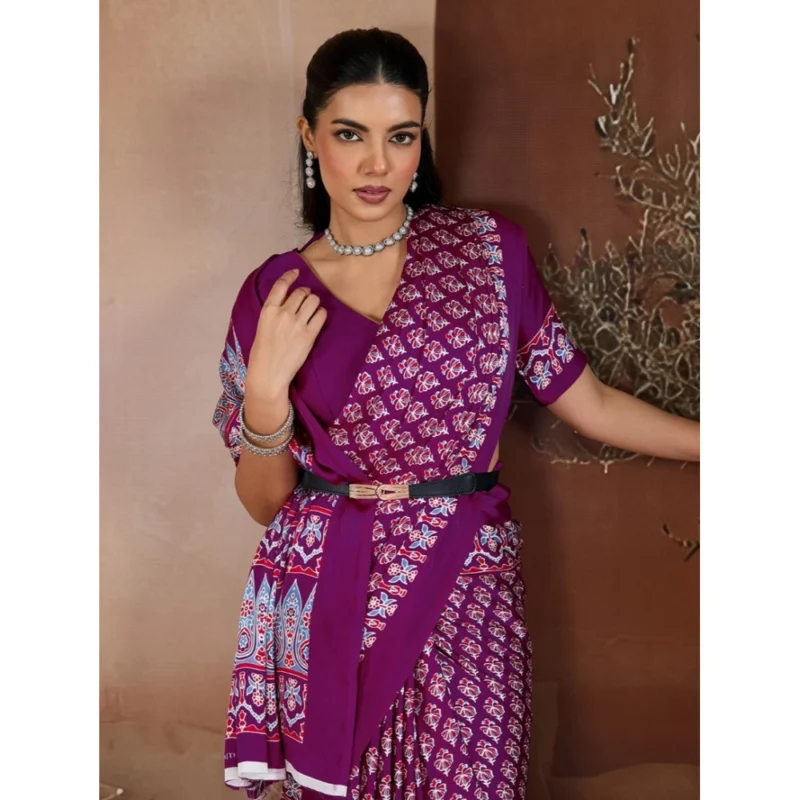 Women’s Satin Crepe Printed Saree With Unstitched Blouse 5.5Mtr (Purple)