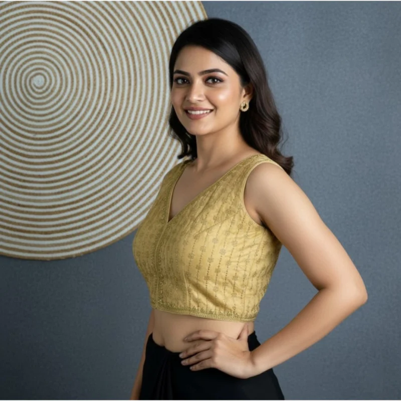 Women’s Silk Blend Embroidered V-Neck Non Padded Blouse (Beige 38 Ready (Alterable up to 42)