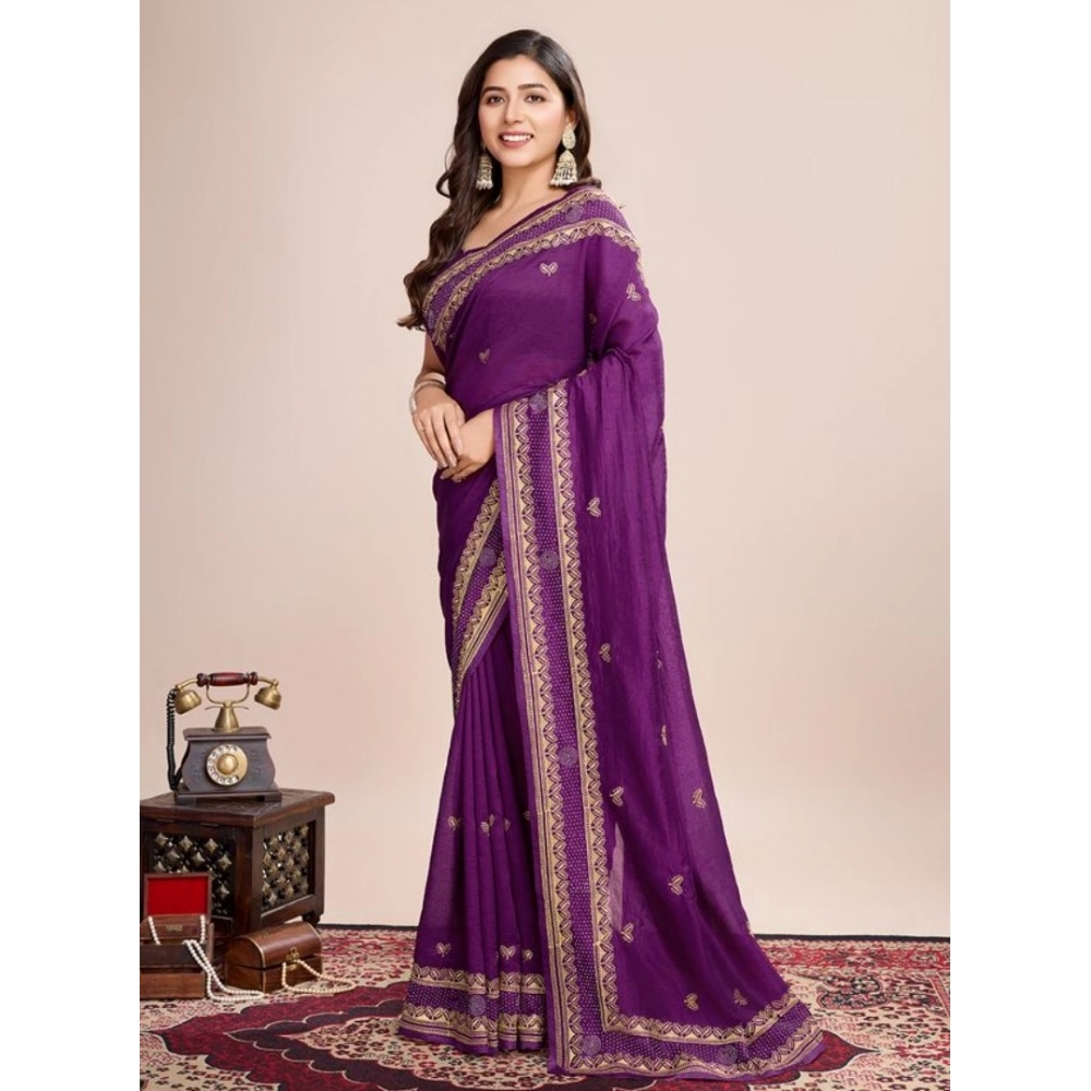 Women’s Vichitra Silk Embroidery Work Saree With Unstitched Blouse 5.5Mtr